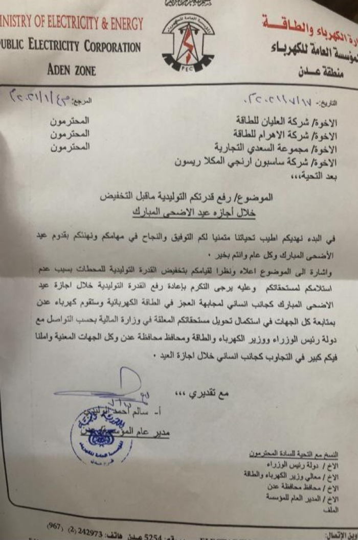 قرر ملاك الطاقة المشتراة، اليوم الأحد، رفع القدرة التوليدية بالعاصمة عدن خلال إجازة عيد الأضحى المبارك.