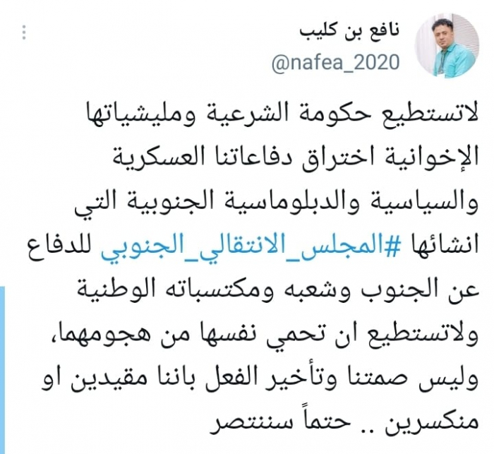 أكد الناشط السياسي نافع بن كليب، أن الشرعية الإخوانية عاجزة عن تجاوز المجلس الانتقالي الجنوبي، سياسيا أو عسكريا، مشددا على أن المجلس يدافع عن الجنوب وشعبه ومكتسابه.