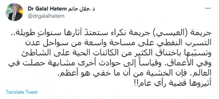 وأضاف: "التسرب النفطي على مساحة واسعة من سواحل عدن وتسبّبها باختناق الكثير من الكائنات الحية على الشاطئ وفي الأعماق. وقياسا إلى حوادث أخرى مشابهة حصلت في العالم، فإن الخشية من أن ما خفي هو أعظم".