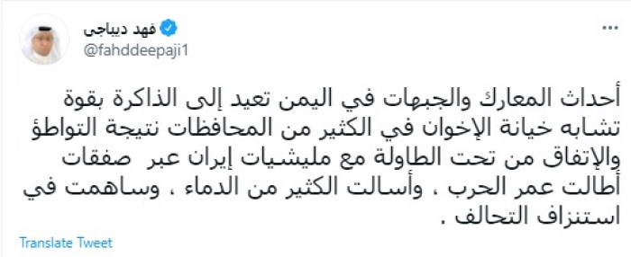 وكتب في تغريدة عبر "تويتر" رصدها "المشهد العربي": "أحداث المعارك والجبهات في اليمن تعيد إلى الذاكرة بقوة تشابه خيانة الإخوان في الكثير من المحافظات".