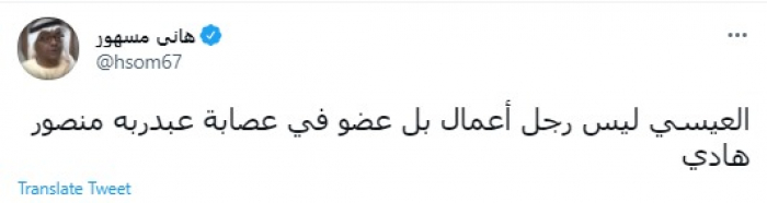 وقال في تغريدة عبر "تويتر" رصدها "المشهد العربي": "العيسي ليس رجل أعمال بل عضو في عصابة عبدربه منصور هادي".