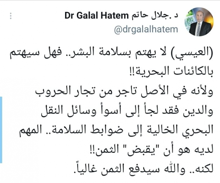 وأردف: "لأنه في الأصل تاجر من تجار الحروب والدين فقد لجأ إلى أسوأ وسائل النقل البحري الخالية من ضوابط السلامة، المهم لديه هو أن "يقبض" الثمن!! لكنه.. والله سيدفع الثمن غاليا".
