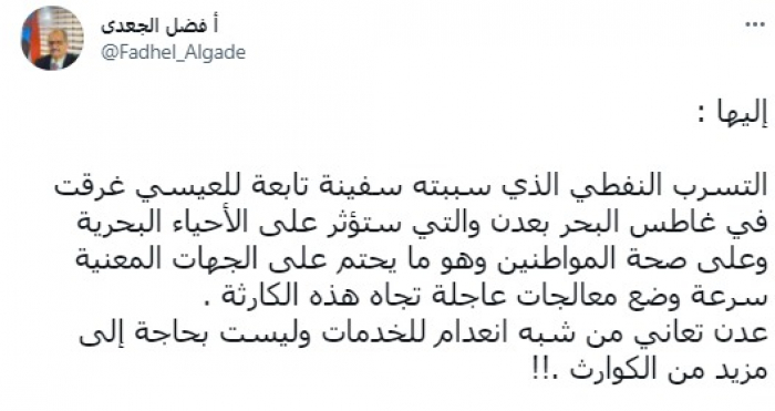 وقال في تغريدة عبر "تويتر" رصدها "المشهد العربي": "التسرب النفطي الذي سببته سفينة تابعة للعيسي غرقت في غاطس البحر بعدن والتي ستؤثر على الأحياء البحرية وعلى صحة المواطنين وهو ما يحتم على الجهات المعنية سرعة وضع معالجات عاجلة تجاه هذه الكارثة".