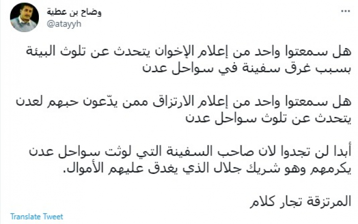 وقال في تغريدة عبر "تويتر" رصدها "المشهد العربي": "هل سمعتوا واحد من إعلام الإخوان يتحدث عن تلوث البيئة بسبب غرق سفينة في سواحل عدن".