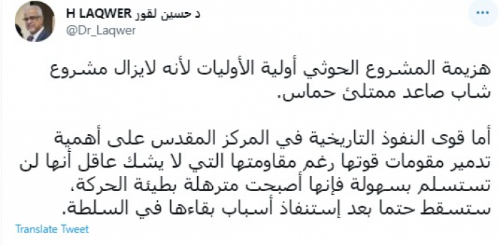 وكتب في تغريدة عبر "تويتر" رصدها "المشهد العربي": "هزيمة المشروع الحوثي أولية الأوليات لأنه لايزال مشروع شاب صاعد ممتلئ حماس".