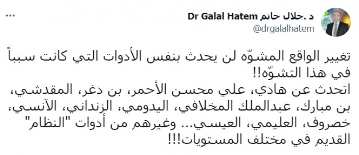 وواصل قائلا: "أتحدث عن هادي، علي محسن الأحمر، بن دغر، المقدشي، بن مبارك، عبدالملك المخلافي، اليدومي، الزنداني، الآنسي، خصروف، العليمي، العيسي... وغيرهم من أدوات "النظام" القديم في مختلف المستويات".