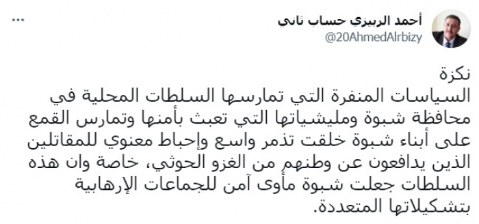 وأكد في تغريدة على حسابه بموقع التدوين المصغر تويتر، اليوم أن: "السياسات المنفرة التي تمارسها السلطات المحلية في محافظة شبوة ومليشياتها التي تعبث بأمنها وتمارس القمع على أبناء شبوة خلقت تذمرا واسعا وإحباطا معنويا للمقاتلين الذين يدافعون عن وطنهم من الغزو الحوثي".