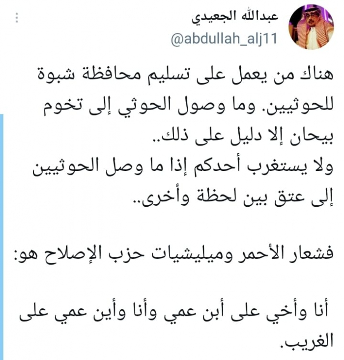 حذر الشاعر الجنوبي عبدالله الجعيدي من تآمر الجنرال الإرهابي علي محسن الأحمر وتنظيم الإخوان الإرهابي ومليشيات الحوثي المدعومة إيرانيا، على شبوة لتسليمها.