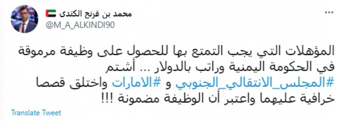 وكتب في تغريدة عبر "تويتر" رصدها "المشهد العربي": "المؤهلات التي يجب التمتع بها للحصول على وظيفة مرموقة في الحكومة اليمنية وراتب بالدولار… اشتم المجلس الانتقالي الجنوبي والإمارات واختلق قصصا خرافية عليهما واعتبر أن الوظيفة مضمونة".