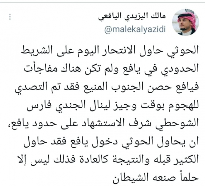 وأشار في تغريدة على حسابه بموقع التدوين المصغر تويتر، اليوم إلى أن: "الحوثي حاول الانتحار اليوم على الشريط الحدودي في يافع ولم تكن هناك مفاجآت فيافع حصن الجنوب المنيع".