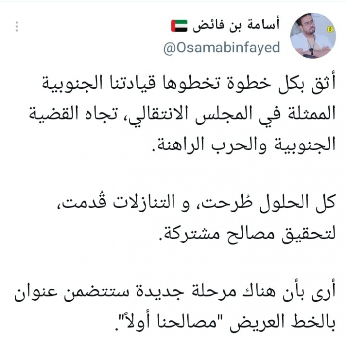 وأشار في تغريدة على حسابه بموقع التدوين المصغر تويتر، اليوم إلى إني: "أثق بكل خطوة تخطوها قيادتنا الجنوبية الممثلة في المجلس الانتقالي، تجاه القضية الجنوبية والحرب الراهنة".