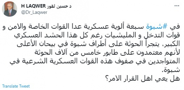 وقال في تغريدة عبر "تويتر" رصدها "المشهد العربي": "في شبوة 7 ألوية عسكرية عدا القوات الخاصة والأمن وقوات التدخل والمليشيات رغم كل هذا الحشد العسكري الكبير، يتجرأ الحوثة على أطراف شبوة في بيحان الأعلى لأنهم معتمدون على طابور خامس من آلاف الحوثة المتواجدين في صفوف هذه القوات العسكرية الشرعية في شبوة".
