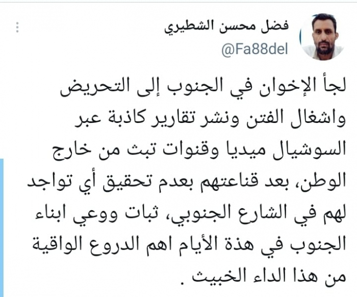 وكشف في تغريدة على حسابه بموقع التدوين المصغر تويتر، اليوم أنه: "لجأ الإخوان في الجنوب إلى التحريض وإشعال الفتن ونشر تقارير كاذبة عبر السوشيال ميديا وقنوات تبث من خارج الوطن، بعد قناعتهم بعدم تحقيق أي تواجد لهم في الشارع الجنوبي".