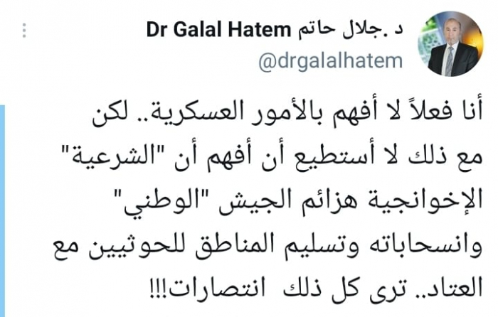 وقال في تغريدة على حسابه بموقع التدوين المصغر تويتر، اليوم: "أنا فعلاً لا أفهم بالأمور العسكرية.. لكن مع ذلك لا أستطيع أن أفهم أن "الشرعية" الإخوانجية ترى هزائم الجيش "الوطني" وانسحاباته وتسليم المناطق للحوثيين مع العتاد.. ترى كل ذلك انتصارات".