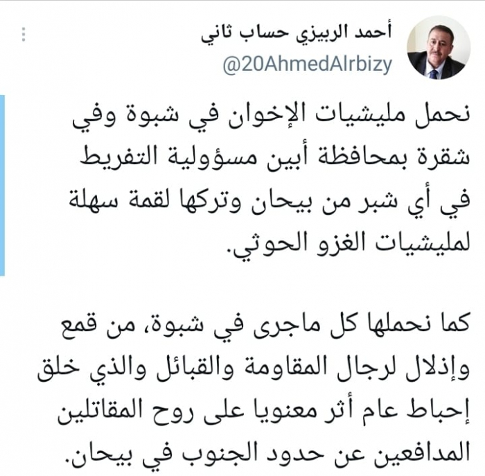 وأكد في تغريدة على حسابه بموقع التدوين المصغر تويتر، اليوم أننا: "نحمل مليشيات الإخوان في شبوة وفي شقرة بمحافظة أبين مسؤولية التفريط في أي شبر من بيحان وتركها لقمة سهلة لمليشيات الغزو الحوثي".
