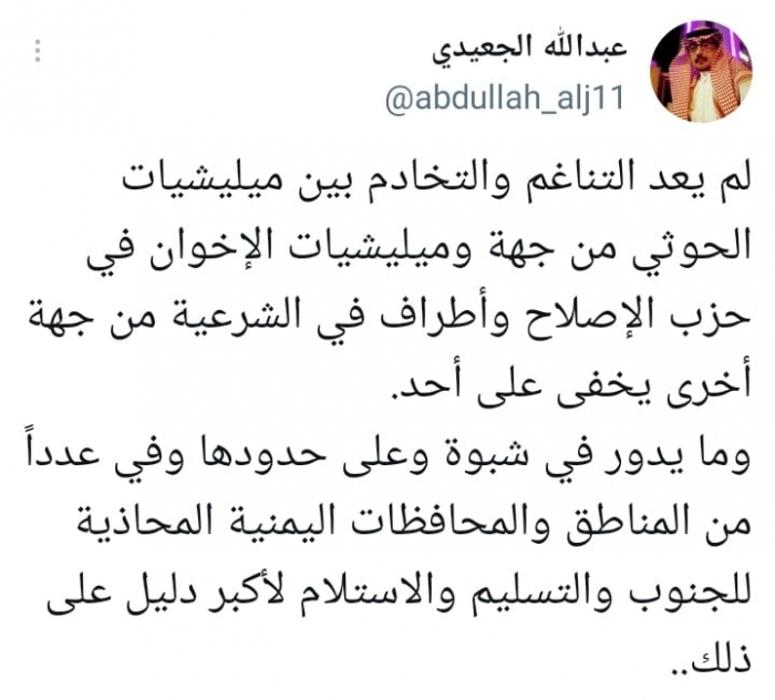 وأشار في تغريدة على حسابه بموقع التدوين المصغر تويتر، اليوم إلى أنه: "لم يعد التناغم والتخادم بين ميليشيات الحوثي من جهة وميليشيات الإخوان في حزب الإصلاح وأطراف في الشرعية من جهة أخرى يخفى على أحد".