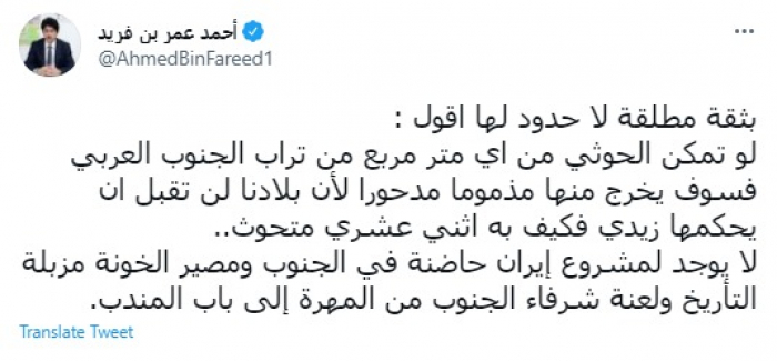 وقال في تغريدة عبر "تويتر" رصدها "المشهد العربي": "بثقة مطلقة لا حدود لها أقول: لو تمكن الحوثي من أي متر مربع من تراب الجنوب العربي فسوف يخرج منها مذمومًا مدحورًا لأن بلادنا لن تقبل أن يحكمها زيدي فكيف به اثني عشري متحوث".