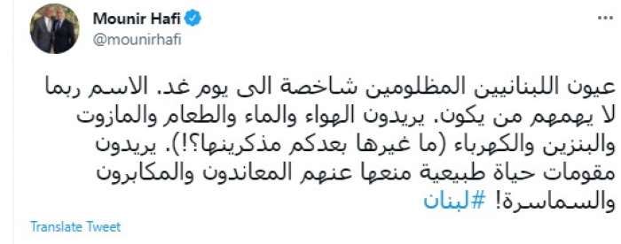 وقال في تغريدة عبر "تويتر" رصدها "المشهد العربي": "عيون اللبنانيين المظلومين شاخصة الى يوم غد. الاسم ربما لا يهمهم من يكون. يريدون الهواء والماء والطعام والمازوت والبنزين والكهرباء (ما غيرها بعدكم مذكرينها؟!)".