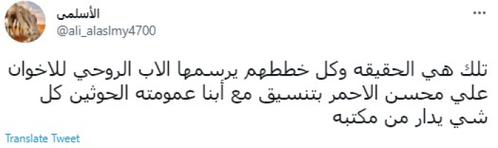 وكتب في تغريدة عبر "تويتر" رصدها "المشهد العربي": "تلك هي الحقيقة وكل خططهم يرسمها الأب الروحي للإخوان علي محسن الاحمر بتنسيق مع أبناء عمومته الحوثيين كل شيء يدار من مكتبه".