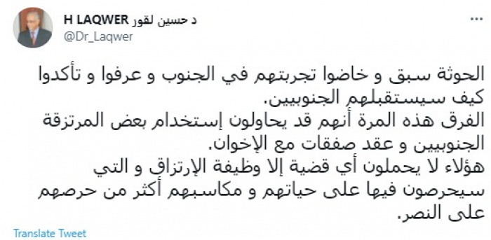 وقال في تغريدة عبر "تويتر" رصدها "المشهد العربي": "الحوثة سبق وخاضوا تجربتهم في الجنوب وعرفوا وتأكدوا كيف سيستقبلهم الجنوبيين".