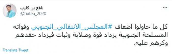 وكتب في تغريدة عبر "تويتر" رصدها "المشهد العربي": "كلما حاولوا إضعاف المجلس الانتقالي الجنوبي وقواته المسلحة الجنوبية يزداد قوة وصلابة وثبات فيزداد حقدهم وكرهم عليه".