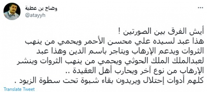 وقال في تغريدة عبر "تويتر" رصدها "المشهد العربي": "ايش الفرق بين الصورتين! هذا عبد لسيده علي محسن الأحمر ويحمي من ينهب الثروات ويدعم الإرهاب ويتاجر باسم الدين وهذا عبد لعبدالملك الحوثي ويحمي من ينهب الثروات وينشر الإرهاب من نوع آخر ويحارب أهل العقيدة".