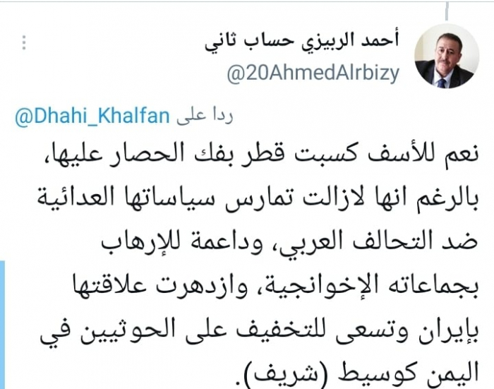 وأكد في تغريدة على حسابه بموقع التدوين المصغر تويتر، اليوم أنه: "نعم للأسف كسبت قطر بفك الحصار عليها، بالرغم أنها لازالت تمارس سياساتها العدائية ضد التحالف العربي، وداعمة للإرهاب بجماعاته الإخوانجية".