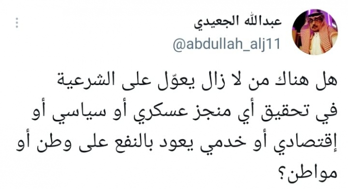 استنكر الشاعر عبدالله الجعيدي اعتماد البعض على الشرعية الإخوانية لتحقيق أي إنجاز عسكري او اقتصادي يخدم المواطنين.