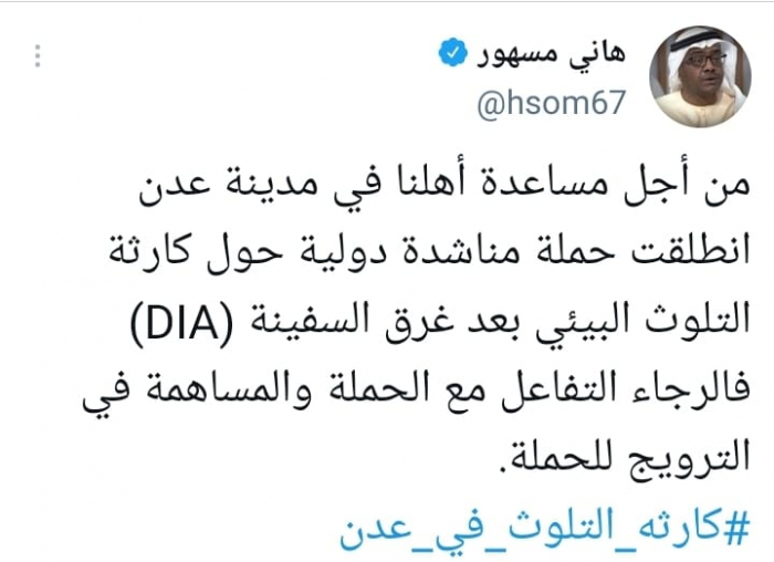 وأوضح في تغريدة على حسابه بموقع التدوين المصغر تويتر، اليوم أنه: "من أجل مساعدة أهلنا في مدينة عدن انطلقت حملة مناشدة دولية حول كارثة التلوث البيئي بعد غرق السفينة (DIA) فالرجاء التفاعل مع الحملة والمساهمة في الترويج للحملة"، مختتما بهاشتاج: "كارثة التلوث في عدن".