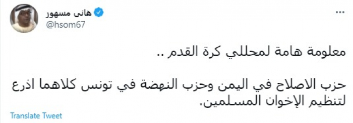 وقال في تغريدة عبر "تويتر" رصدها "المشهد العربي": "معلومة هامة لمحللي كرة القدم.. حزب الإصلاح في اليمن وحزب النهضة في تونس كلاهما أذرع لتنظيم الإخوان المسلمين".