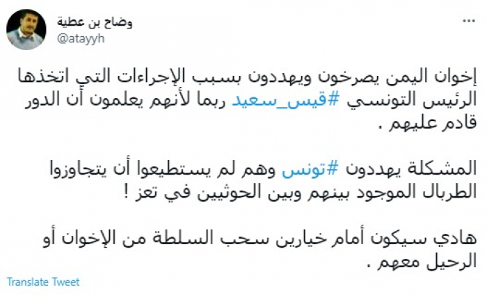 وقال في تغريدة عبر "تويتر" رصدها "المشهد العربي": "إخوان اليمن يصرخون ويهددون بسبب الإجراءات التي اتخذها الرئيس التونسي قيس سعيد ربما لأنهم يعلمون أن الدور قادم عليهم".