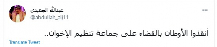وقال في تغريدة عبر "تويتر" رصدها "المشهد العربي": "أنقذوا الأوطان بالقضاء على جماعة تنظيم الإخوان".
