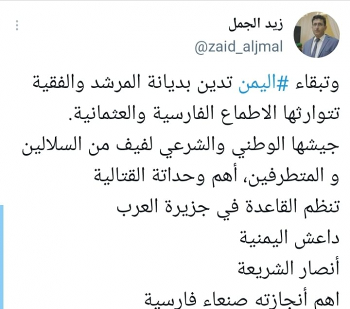 وقال في تغريدة على حسابه بموقع التدوين المصغر تويتر، اليوم إنه: "تبقى اليمن تدين بديانة المرشد والفقيه تتوارثها الأطماع الفارسية والعثمانية".