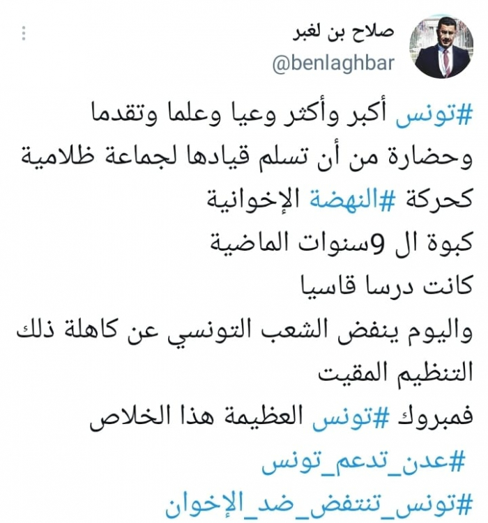 وأكد أن: "كبوة الـ 9 سنوات الماضية كانت درسا قاسيا، واليوم ينفض الشعب التونسي عن كاهلة ذلك التنظيم المقيت فمبروك تونس العظيمة هذا الخلاص"، متابعا بهاشتاج: "عدن تدعم تونس" و"تونس تنتفض ضد الإخوان".