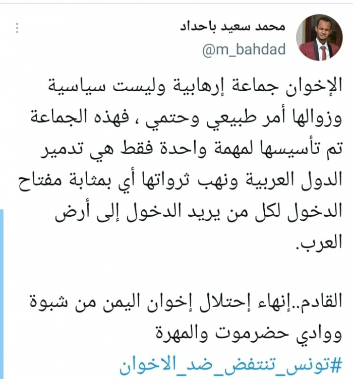 أكد الناشط السياسي محمد سعيد باحداد، أن الإخوان تنظيم إرهابي وليس فصيل سياسي، متوقعا أن يلحق الجنوب بتونس ويتطهر من التنظيم الإخواني.