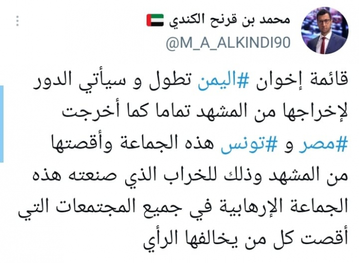 وقال في تغريدة على حسابه بموقع التدوين المصغر تويتر، اليوم إن: "قائمة إخوان اليمن تطول وسيأتي الدور لإخراجها من المشهد تماما كما أخرجت مصر وتونس هذه الجماعة وأقصتها من المشهد".