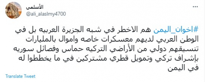 وقال في تغريدة عبر "تويتر" رصدها "المشهد العربي": "إخوان اليمن هم الأخطر في شبه الجزيرة العربية بل في الوطن العربي".
