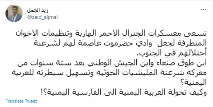 وكتب في تغريدة عبر "تويتر" رصدها "المشهد العربي": "تسعى معسكرات الجنرال الأحمر الهاربة وتنظيمات الإخوان المتطرفة لجعل وادي حضرموت عاصمة لهم لشرعنة احتلالهم في الجنوب".