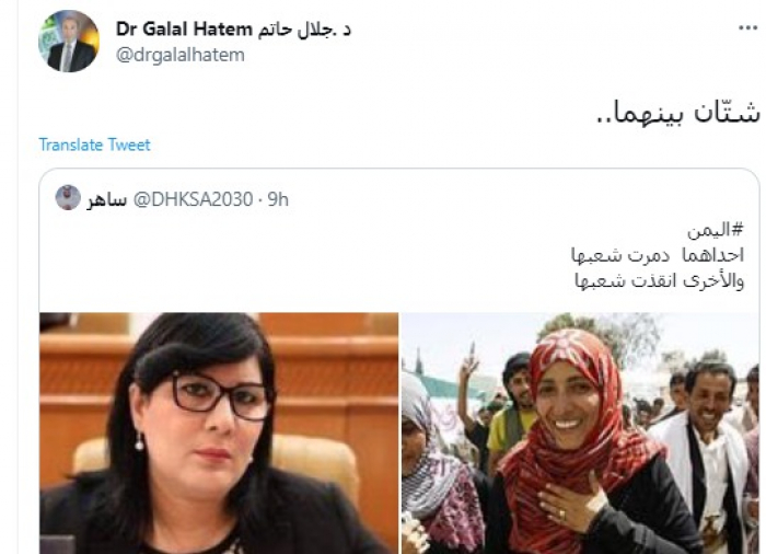 قال الأكاديمي الجنوبي رئيس جامعة أم القيوين الإماراتية الدكتور جلال حاتم، اليوم الثلاثاء، إنه شتان الفارق بين القيادية الإخوانية المدعوة توكل كرمان، والسياسية التونسية البارزة عبير موسى.