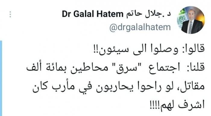 وأشار في تغريدة على حسابه بموقع التدوين المصغر تويتر، اليوم إلى أنهم: "قالوا: وصلوا إلى سيئون!!"، موضحا: "قلنا: اجتماع (سرق) محاطين بمائة ألف مقاتل، لو راحوا يحاربون في مأرب كان أشرف لهم".