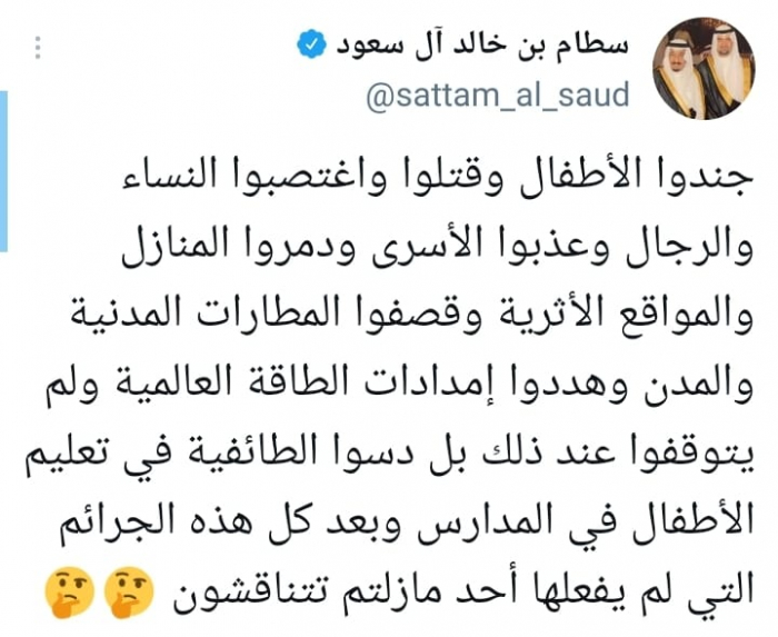 استنكر الأمير السعودي سطام بن خالد آل سعود استمرار الولايات المتحدة الأمريكية في عقد مباحثات حول تصعيد مليشيا الحوثي الإرهابية، بعد ارتكابهم جميع الجرائم الإنسانية.
