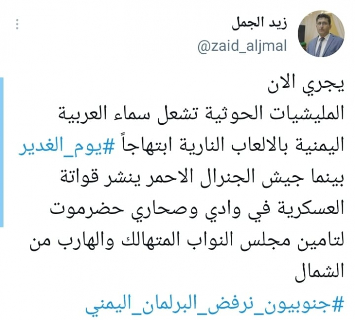 أكد زيد الجمل السكرتير الصحفي لرئيس المجلس الانتقالي الجنوبي، أن الاحتفالات بصفوف المليشيا الحوثية الإرهابية بيوم الغدير تتزامن مع تحشيد في وادي حضرموت لمليشيات الشرعية الإخوانية لتأمين برلمان منتهي الولاية.