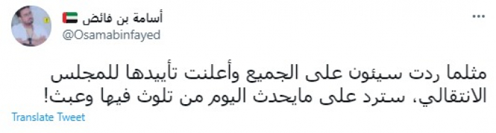 وكتب في تغريدة عبر "تويتر" رصدها "المشهد العربي": "مثلما ردت سيئون على الجميع وأعلنت تأييدها للمجلس الانتقالي، سترد على ما يحدث اليوم من تلوث فيها وعبث".