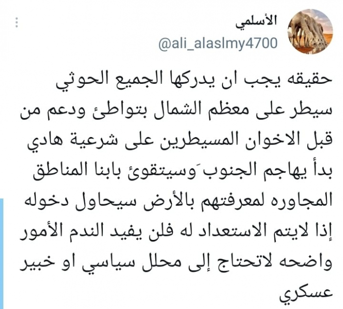 حذر الناشط السياسي علي الأسلمي من أن مليشيات الحوثي الإرهابية تتجه إلى مهاجمة الجنوب بعدما سيطرت على محافظات الشمال بتواطؤ من الإخوان الإرهابيين.