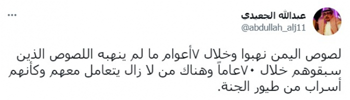 وأكد في تغريدة على حسابه بتويتر، اليوم الخمس، أن: "لصوص اليمن نهبوا وخلال 7 أعوام ما لم ينهبه اللصوص الذين سبقوهم خلال 70 عاما".