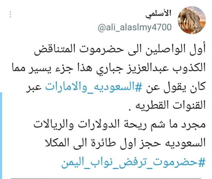 وأوضح: "مجرد ما شم ريحة الدولارات والريالات السعودية حجز أول طائرة إلى المكلا"، مختتما بهاشتاج: "حضرموت ترفض نواب اليمن".