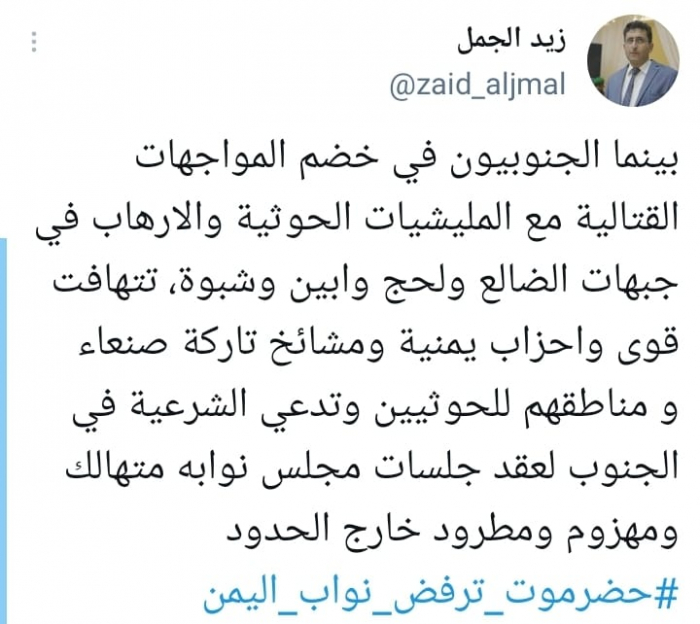 هاجم زيد الجمل السكرتير الصحفي لرئيس المجلس الانتقالي الجنوبي، استغلال الشرعية الإخوانية لانشغال الجنوبيين بمحاربة مليشيا الحوثي الإرهابية، لدعوة مجلسها للانعقاد في حضرموت.