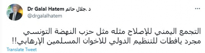 وقال في تغريدة عبر "تويتر" رصدها "المشهد العربي": "التجمع اليمني للإصلاح مثله مثل حزب النهضة التونسي مجرد يافطات للتنظيم الدولي للإخوان المسلمين الإرهابي".