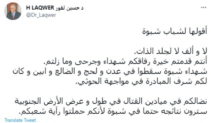 وجه المحلل السياسي الدكتور حسين لقور، اليوم الجمعة، رسالة هامة لشباب شبوة، مؤكدًا أن نضال هؤلاء الشباب ستظهر نتائجه قريبًا.