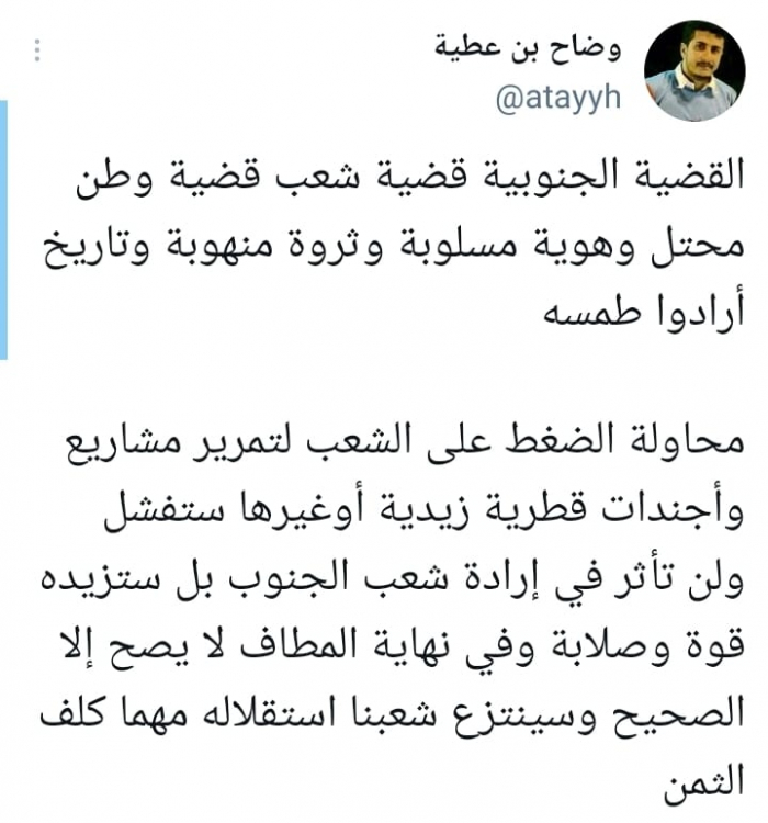 وأشار في تغريدة على حسابه بموقع التدوين المصغر تويتر، اليوم إلى أن: "القضية الجنوبية قضية شعب قضية وطن محتل وهوية مسلوبة وثروة منهوبة وتاريخ أرادوا طمسه".